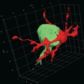 In a rat model of neuronal degeneration, this 3D reconstruction, from a series of microscopy images, shows a microglial cell (red) contacting a neuron (green) in the spinal cord. (Jiang, Sarkar et al. 2018).