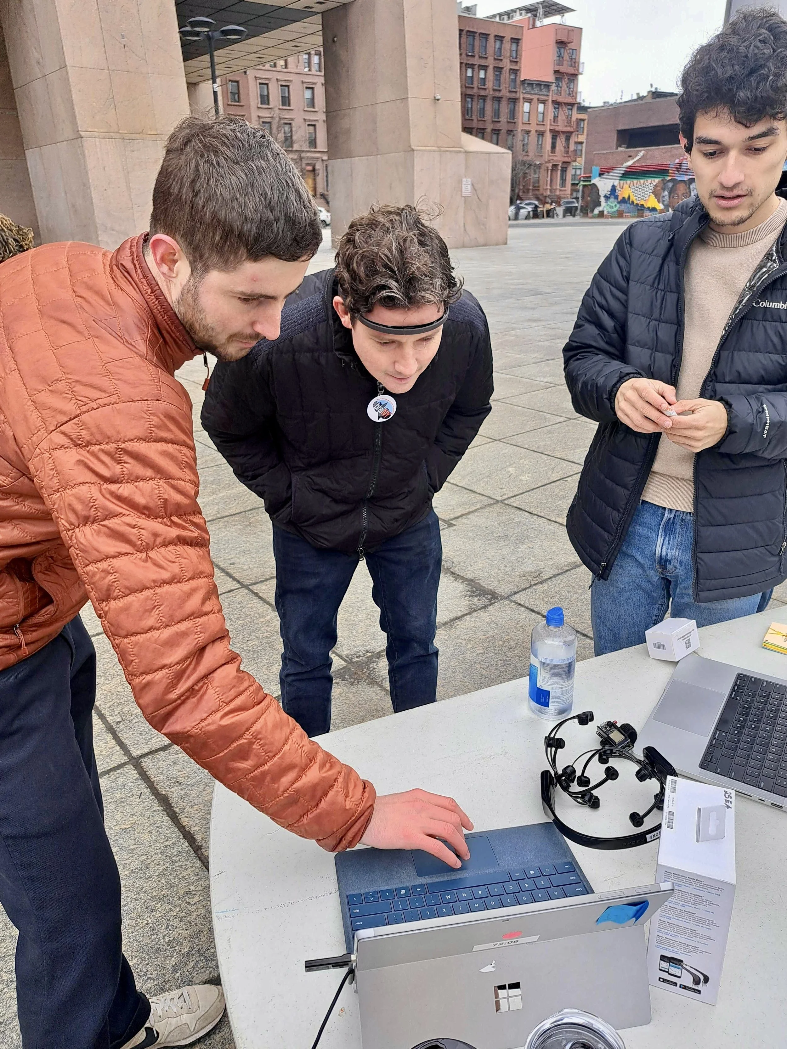 A participant wears an EEG headset that records their brain activity, while volunteers from MindHive walk them through the resulting signals on a tablet screen.