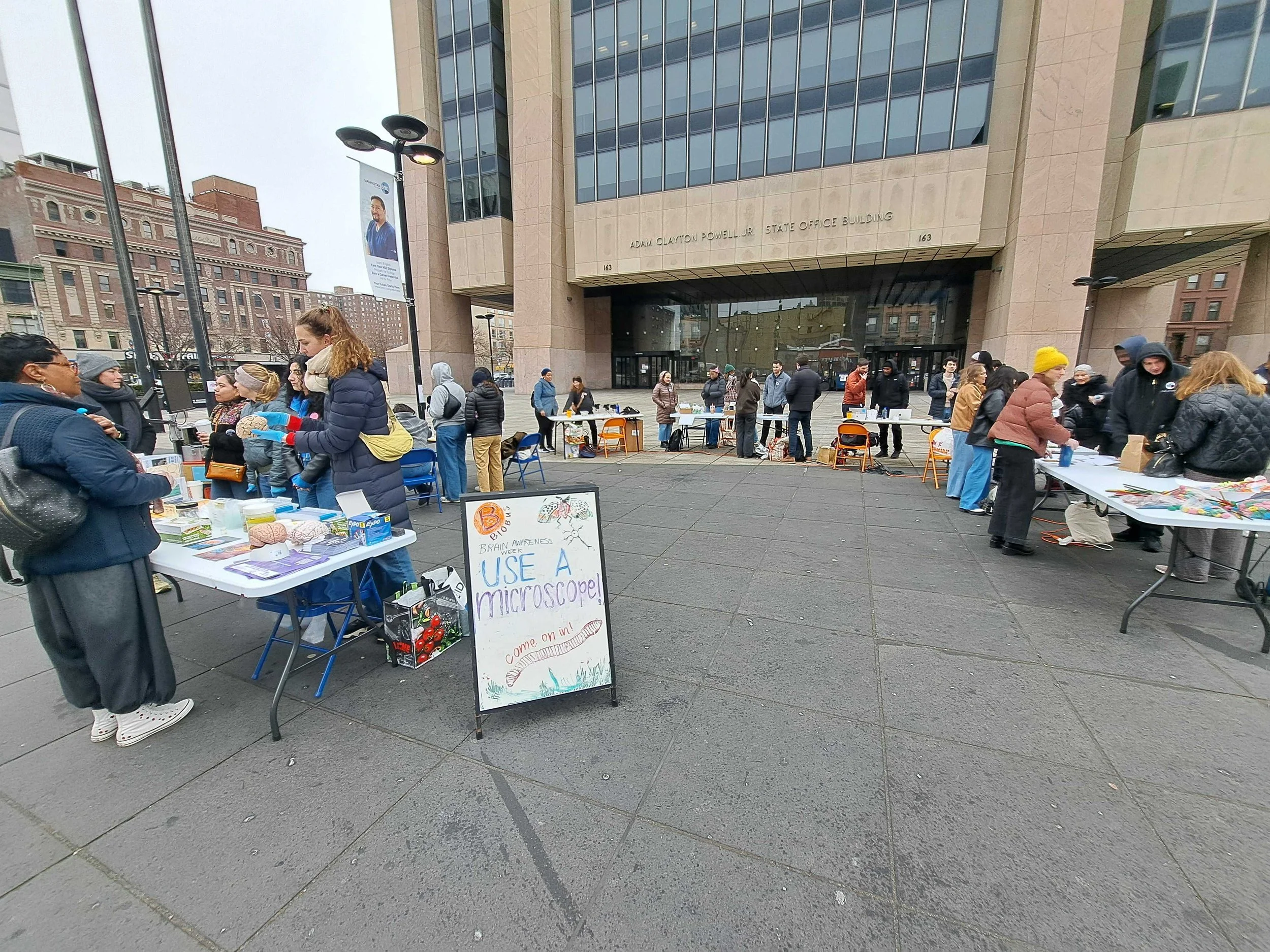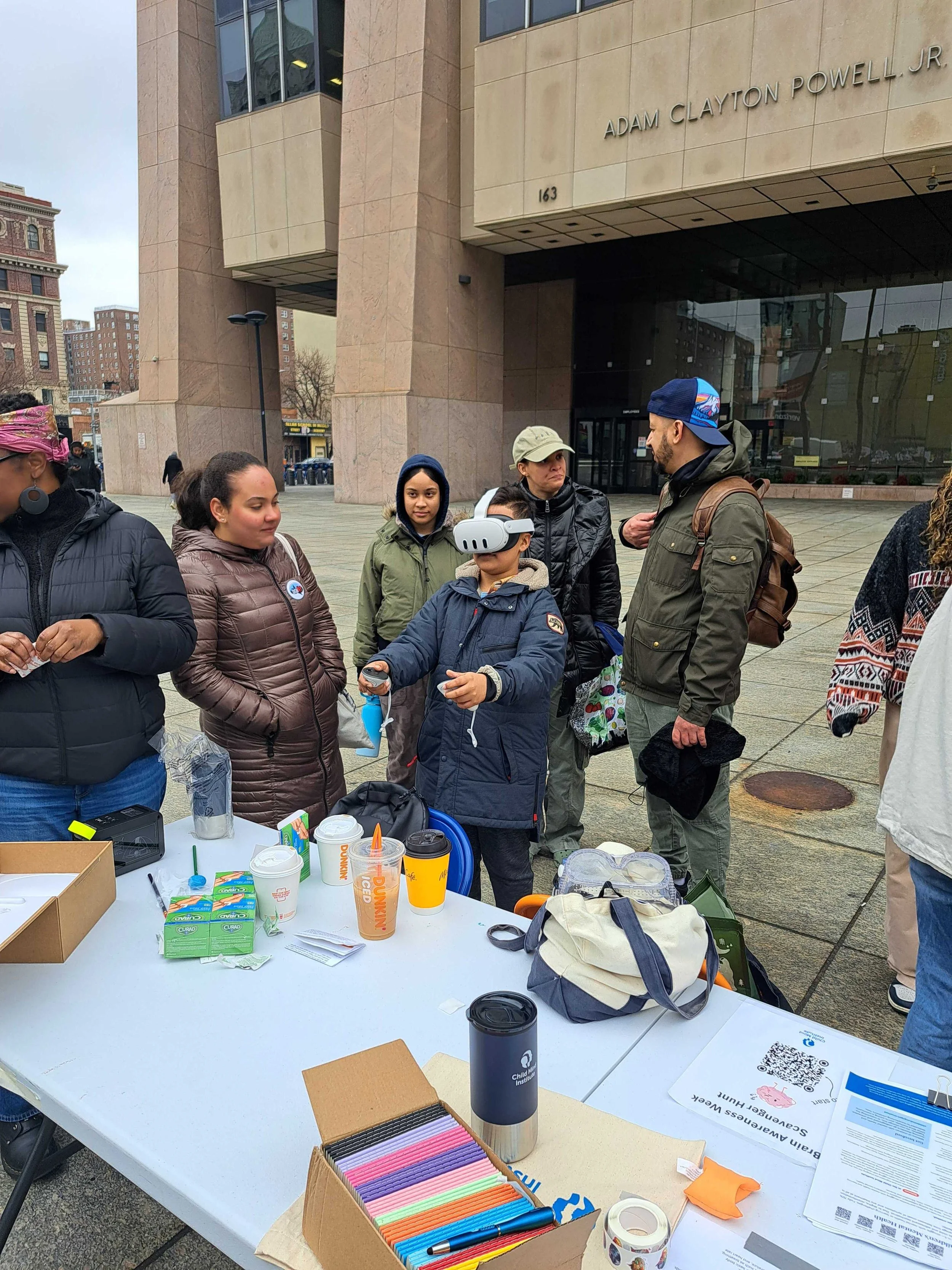 Tables are set up outside the Adam Clayton Powell Jr. Office Building for the annual BraiNY x BioBus Brain Awareness Week event. Volunteers share a variety of brain-related activities with the East Harlem community.